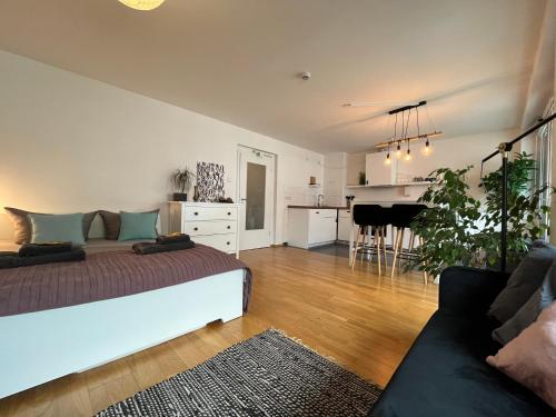 Questo appartamento offre 1 camera da letto, un soggiorno con TV a schermo piatto, una cucina con utensili e 1 bagno con vasca o doccia e set di cortesia.
